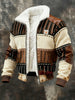 Men's Retro Color Block Print Casual Fur Collar Zip-up Sweatshirt