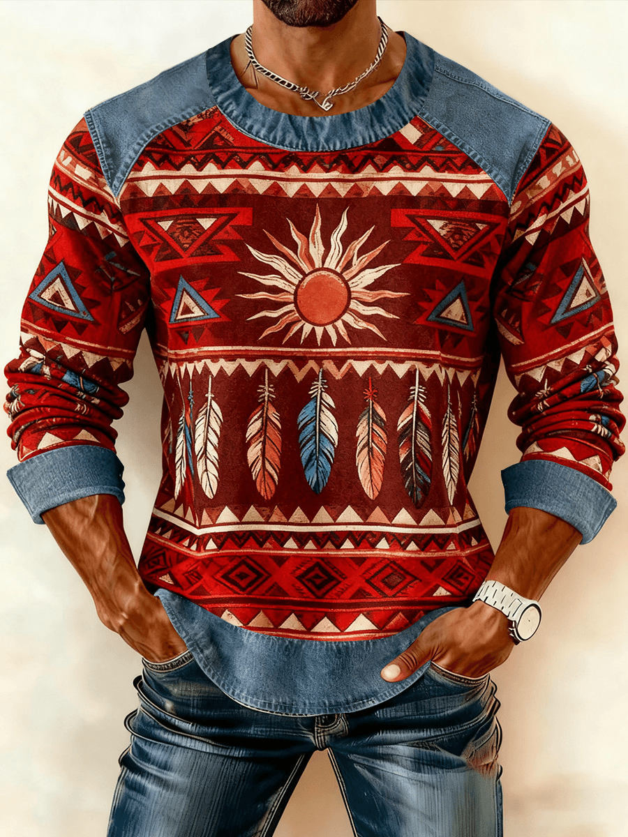 Men's Vintage Western Denim Patchwork Printed Sweatshirt