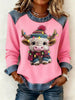 Women's Casual Retro Western Cute Christmas Highland Cow Denim Patchwork Top