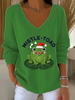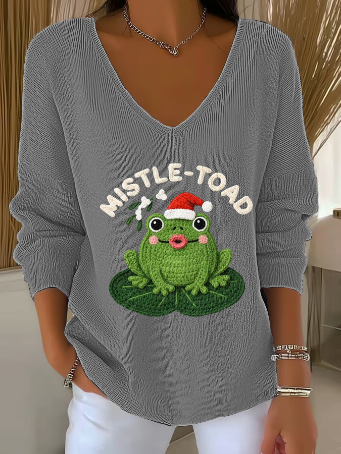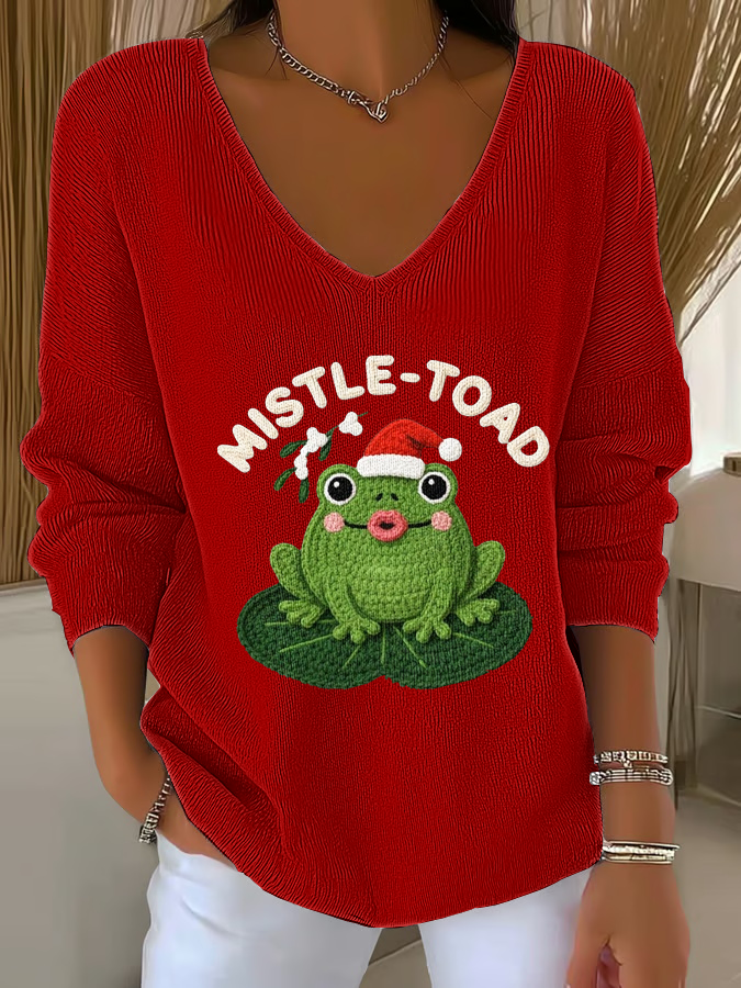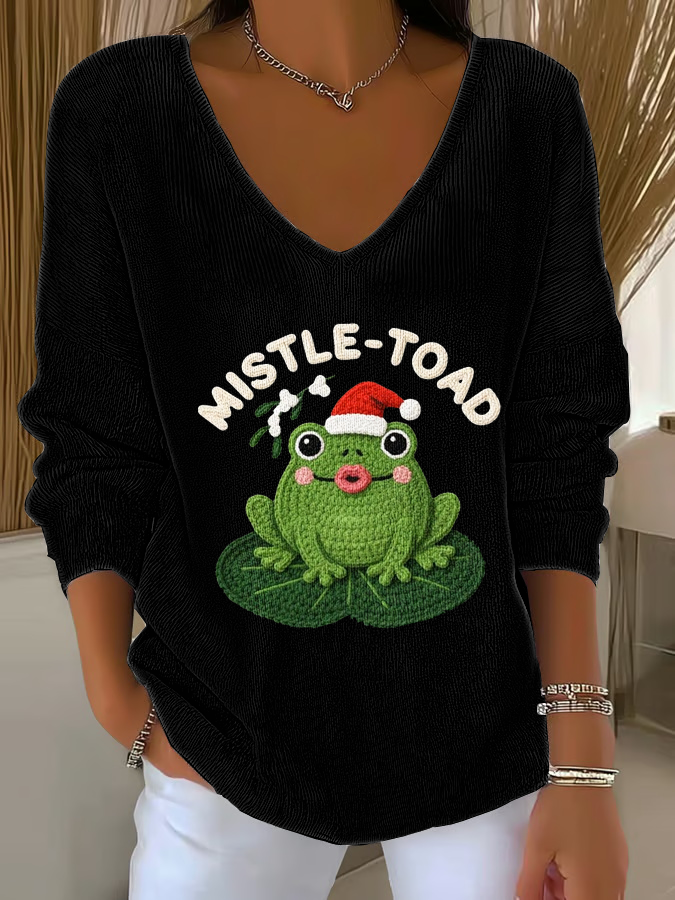 Women's Frog Christmas Mistle Toad Art Print V-Neck Ribbed Top