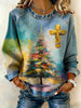 Women's Merry Christmas Christmas Tree Cross Waffle Denim Patchwork Top